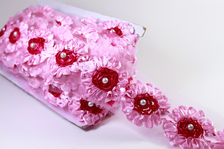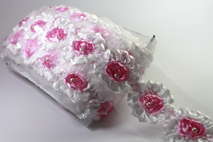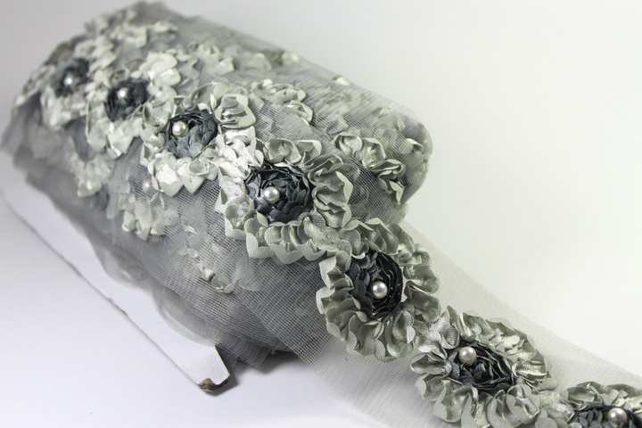 Rosen auf Tüllgrund appliziert. Jede Rose mit Perle dekoriert.
