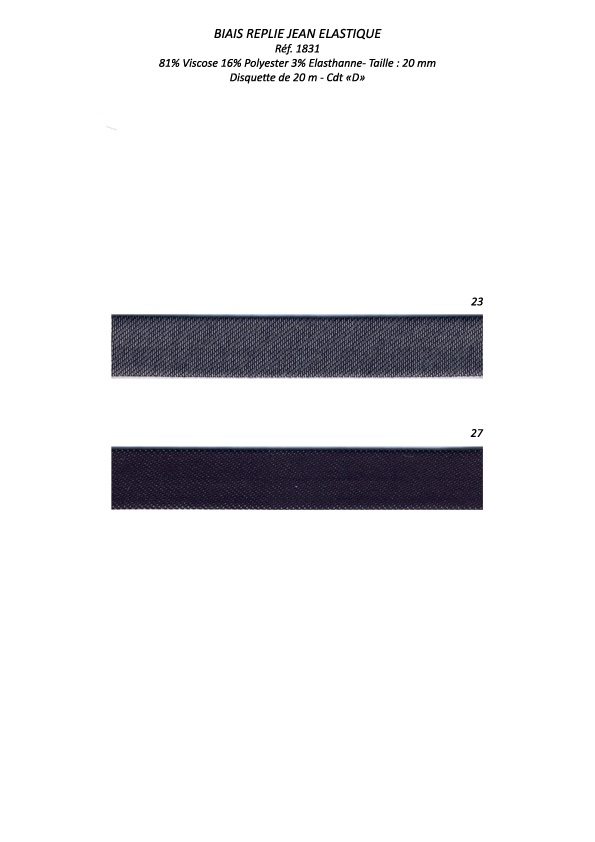 Vorgefalztes Schrägband in Jeansoptik für elastische StoffeBreite: 20 mm, fertige Breite 10 mm81% Viscose, 16% Polyester, 3% ElasthanDieses Band ist leider noch im Rückstand