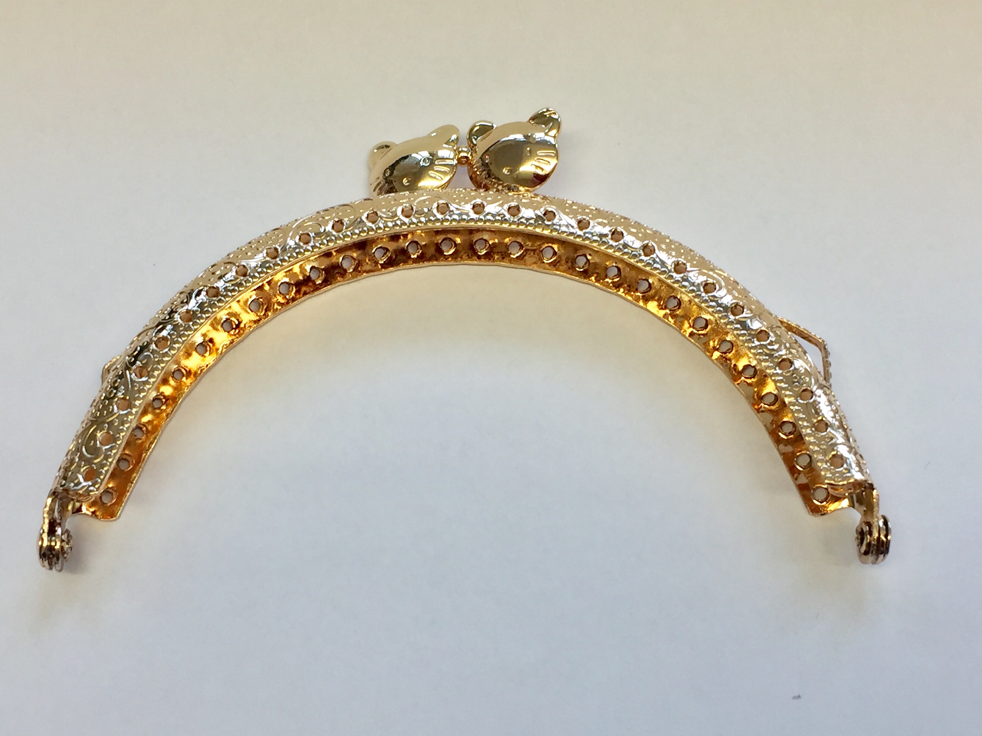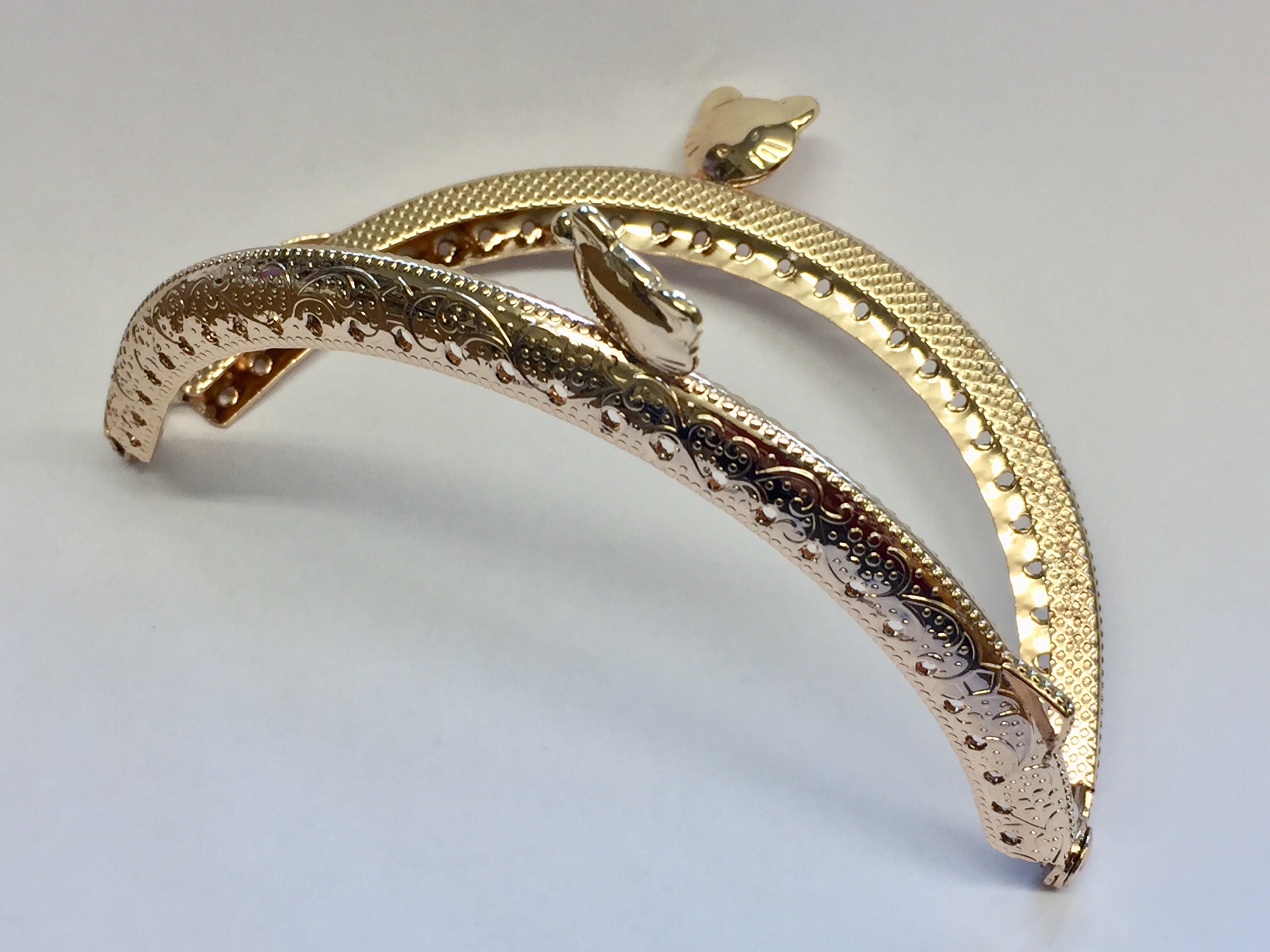 Metallrahmen zur Herstellung von Handtasche. Der Rahmen ist mit feinen Ornamenten verziert, die ihm Vintage Aussehen verleihen.