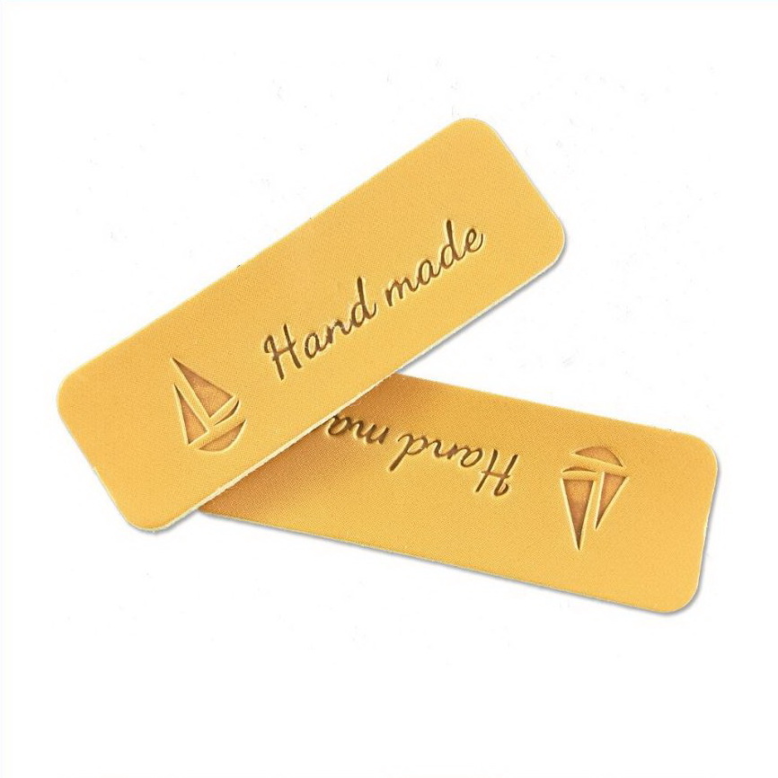 PU-LabelOhne Löcher. Dieses Label kann entweder mit der Nähmaschine und Ledernadel fixiert werden. Alternativ mit der Aale Löcher bohren und von Hand fixieren und mit Nieten befestigen. Nieten sind separat erhältich