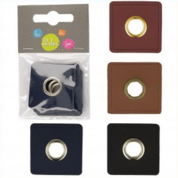 Quadratische Kunstleder Patch mit ÖseDurchmesser Öse: 10 mmGrösse Lederpatch: 35 x 35 mmTüte mit 4 Stück (2 Paare)
