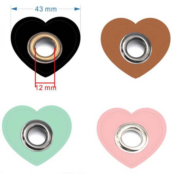 Kunstlederpatch in Herzform mit 12 mm Durchmesser. Der Patch wird mit der Nähmaschine aufgesteppt. Danach an entsprechender Stelle im Stoff ein Loch schneiden.
