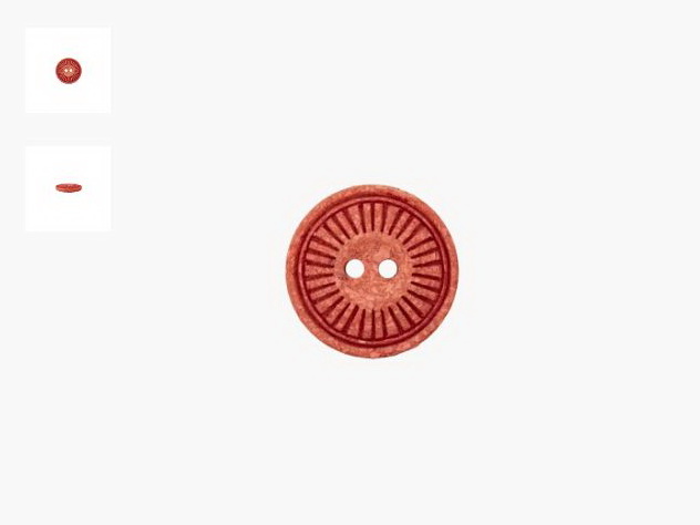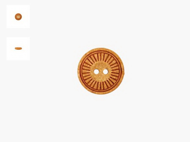 Raffiniert gemachter Polyesterknopf. Dank seiner grobkörnigen Struktur wirkt er wie aus Kokos oder gepressten Naturmaterialien hergestellt.